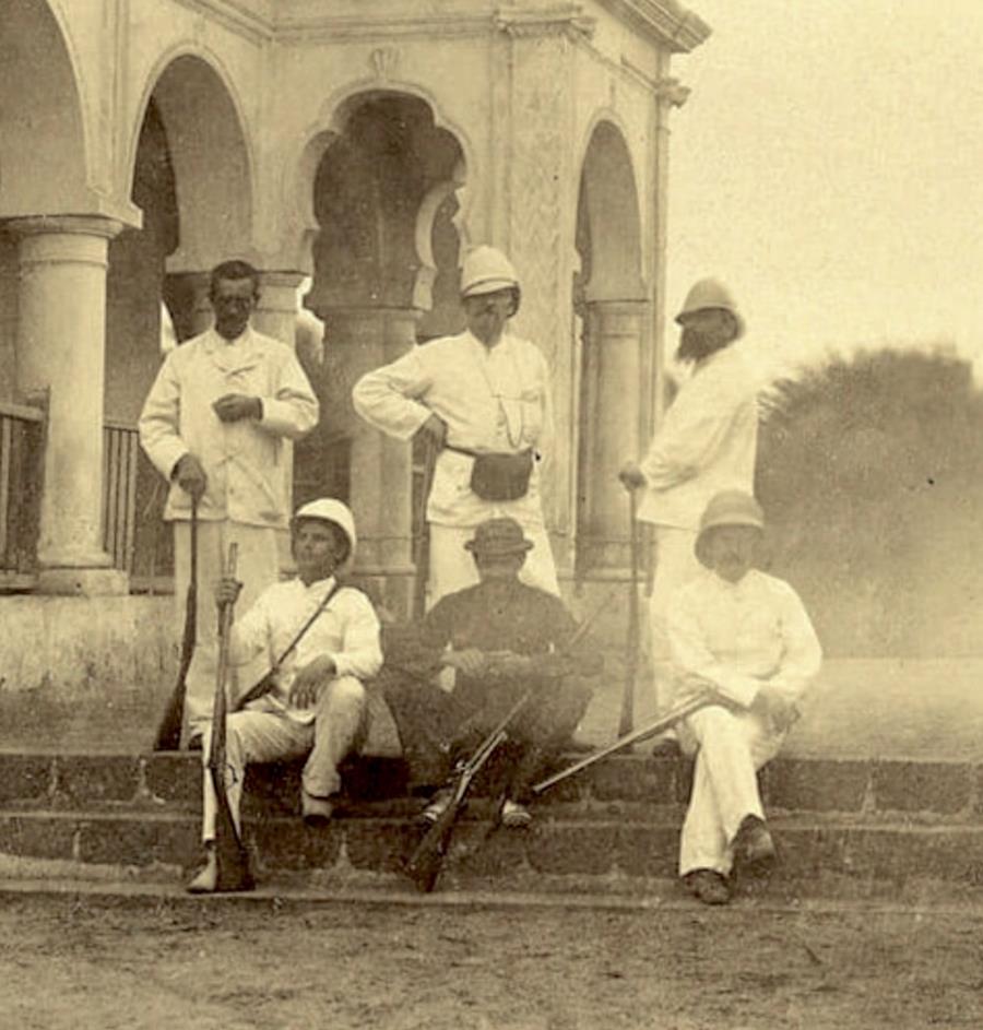 At that time, Sheikh Othman was a small village with only a few hundred inhabitants, located about ten kilometers north of Aden, between Aden Camp and the town of Lahej. The site was not only an oasis of remarkable freshness in an otherwise arid region, but also, according to Revoil, the location of possible remains of a Phoenician-era glassworks. In this group portrait, six men, each holding a rifle, are posed in two rows in front of the manor house of Hassan Ah, a wealthy notable from Aden.