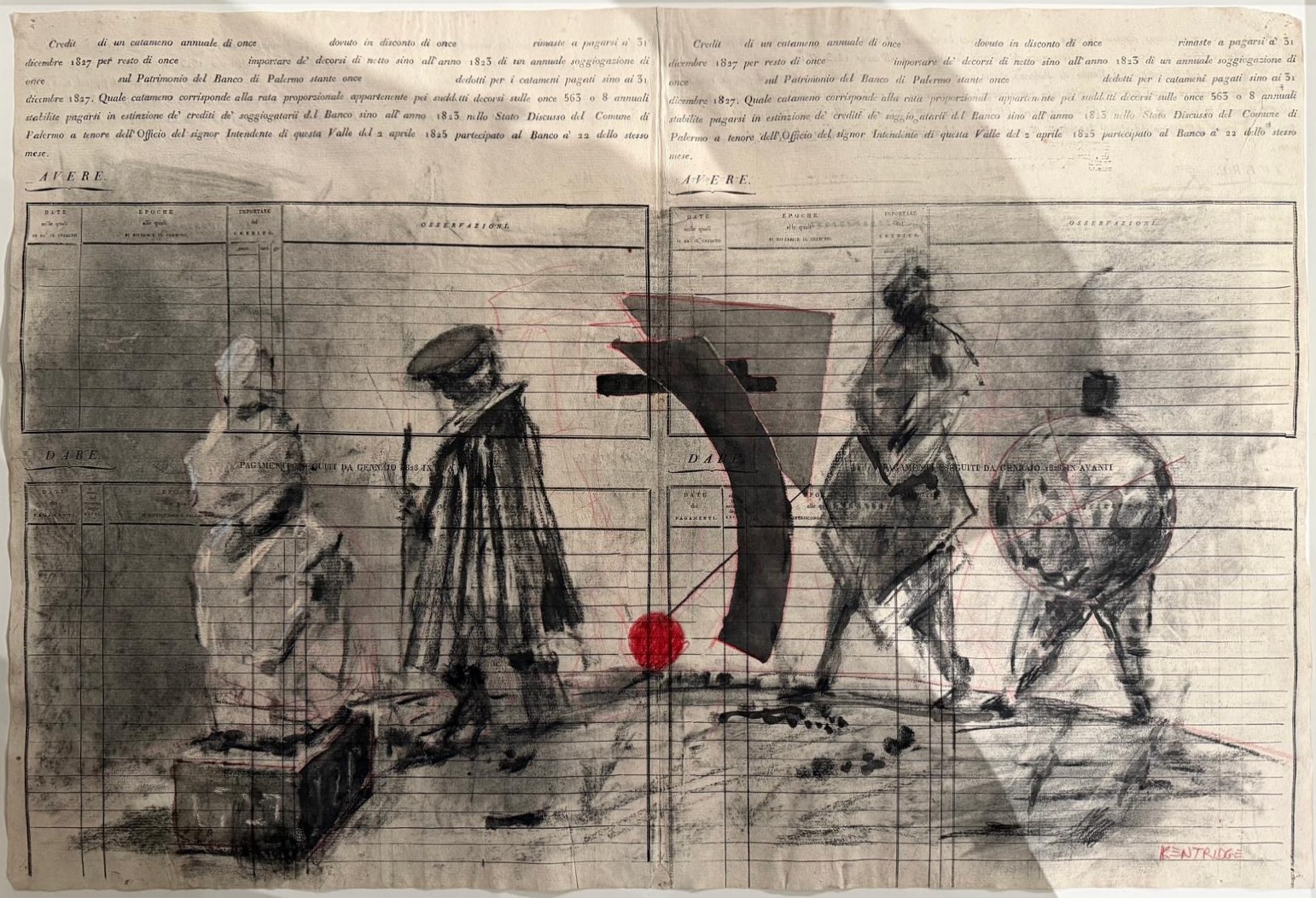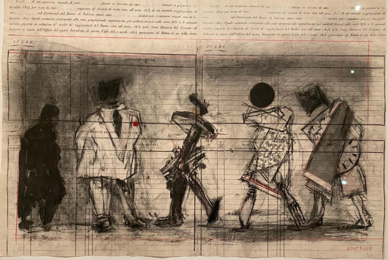 Un passaggio ancora più esplicito riguarda Triumphs and Laments (Roma, 2016). Nella descrizione del progetto, Kentridge racconta che i disegni preparatori a carboncino furono realizzati su pagine di un vecchio cash book, usando linee e margini del registro per provare scala e giunture del futuro fregio sul travertino. Anche qui la contabilità agisce come griglia e come memoria materiale, prima ancora che come simbolo. Mai un episodio isolato, ma sempre una costellazione.