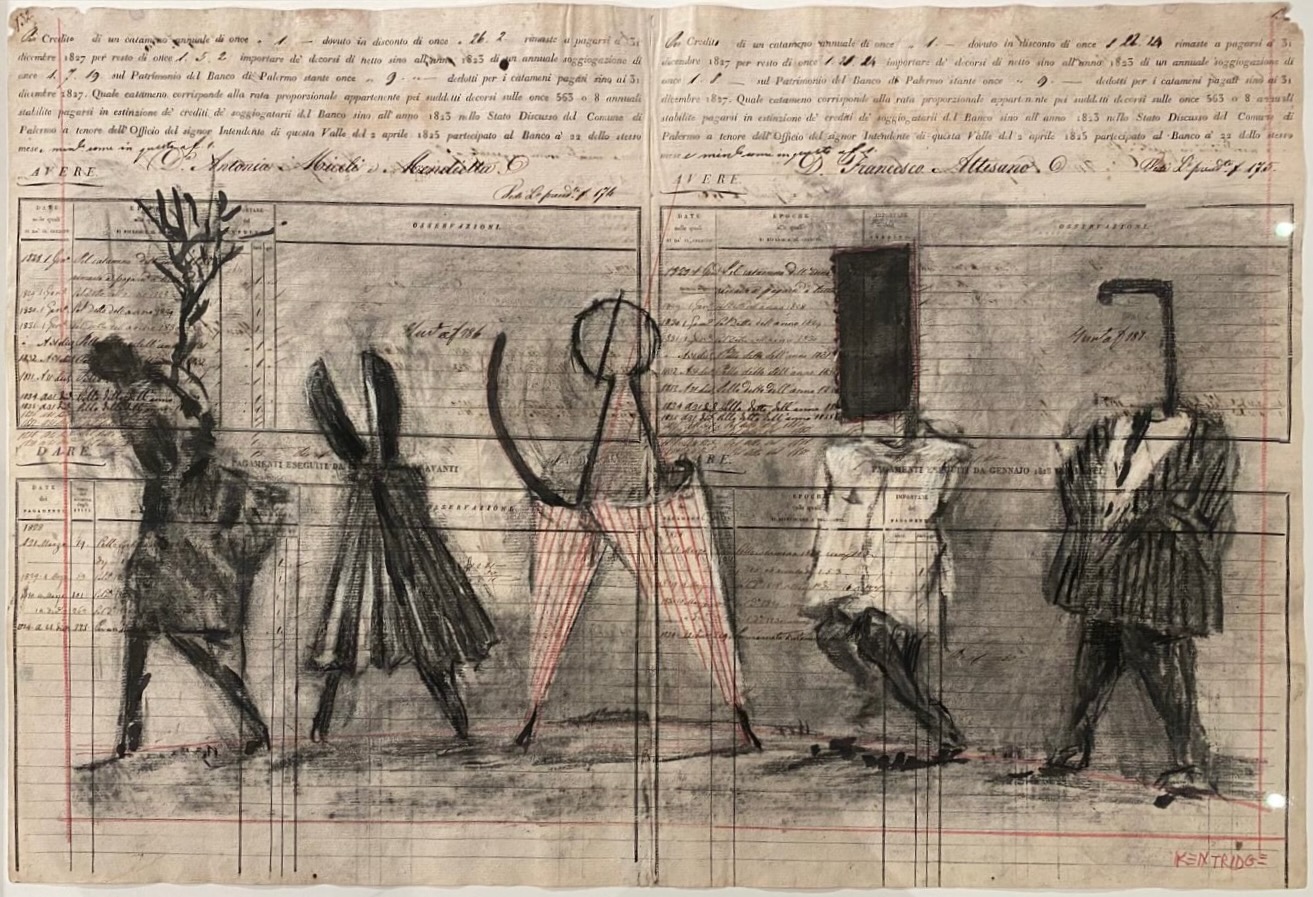 Kentridge sceglie i libri contabili perché sono, insieme, documento e sintomo. L’archivio economico promette trasparenza – « tutto è registrato » – ma è anche un dispositivo di rimozione: traduce una realtà materiale e immateriale violenta in numeri equivalenti, rendendo invisibili le asimmetrie che li producono. Disegnare su quelle pagine significa riaprire il conto, immettere uno sbilanciamento, un attrito formale dove c’era solo « quadratura ».