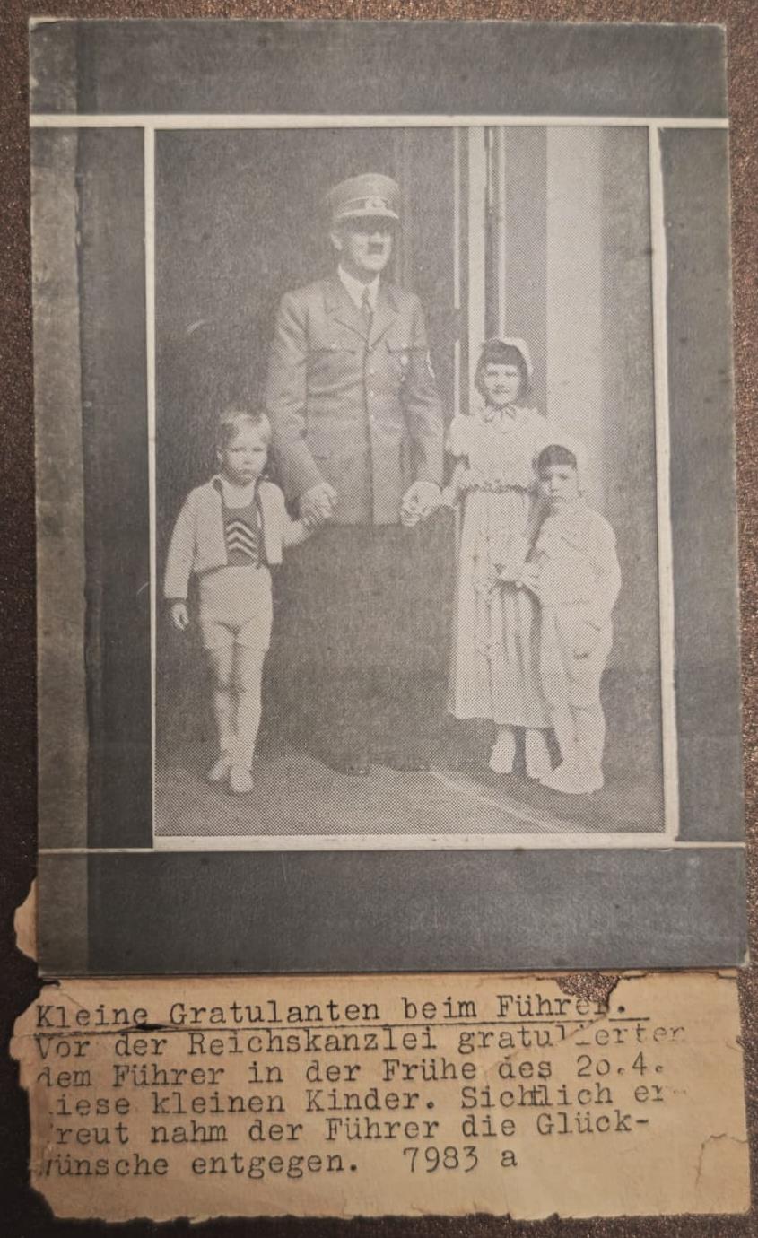 The same channel that carried a child’s portrait on 20 April 1941 carried the caption: « Kleine Gratulanten beim Führer. Vor der Reichskanzlei gratulierten dem Führer in der Frühe des 20.4. diese kleinen Kinder. » (« Little well-wishers for the Führer. In front of the Reich Chancellery, these little children congratulated the Führer in the early hours of April 20. »)