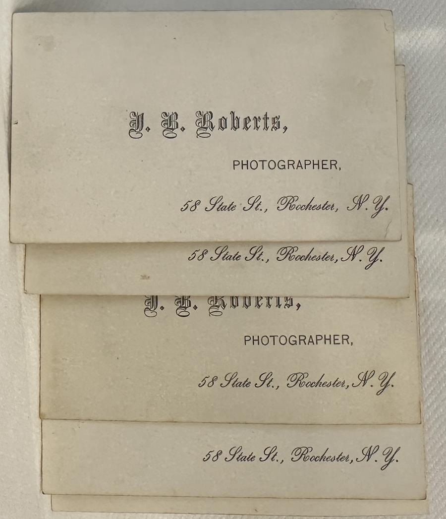 Only a small number of Roberts’s photographs can be securely identified today, but four groups of material preserve traces of his work. First, a Roberts family album contains portraits of relatives and friends. Second, a set of cartes de visite bearing his imprint, ‘J. B. Roberts, 58 State Street, Rochester,’ survives in institutional and private collections. Third, a substantial series of CDVs of Union soldiers is preserved at the New York State Military Museum in Albany.