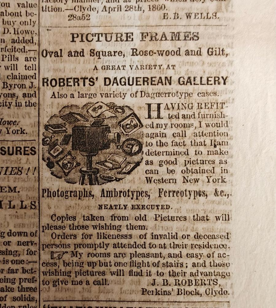 Beginning in April 1860, Roberts advertised in the Clyde Weekly Times as the local photographer for portraits and outdoor views.