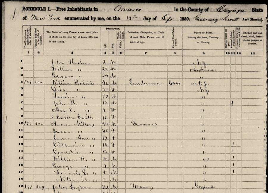 In the 1850 federal census, the family appears in Owasco, Cayuga County, in the Finger Lakes region: on lines 4 to 8, John B., 13, is recorded living with his father William, 46, his mother Disa, 32, his sister Lovinia (Velona), 12, and the baby Clemena Axa “Meta”, aged one.