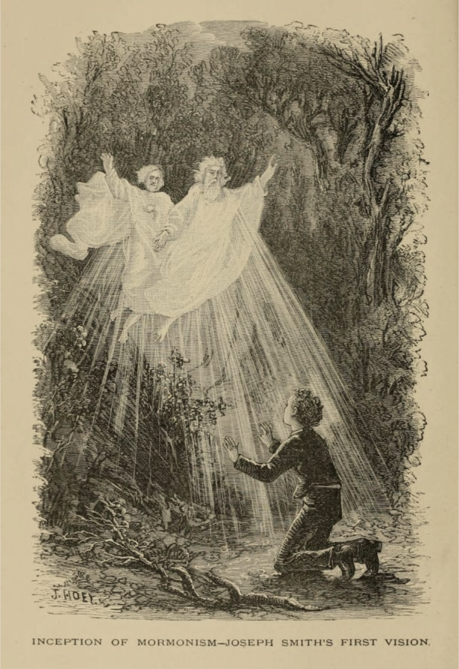 This engraving, widely circulated in the nineteenth century, evokes Joseph Smith’s First Vision, the foundational scene of Mormonism said to have taken place in the woods near Palmyra. It hints at the kind of religious imagination that already haunted the landscape where Roberts began his career.