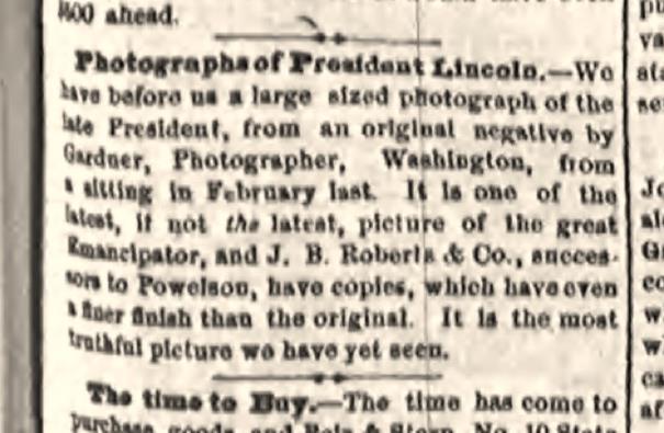 Photographs of President Lincoln. – We have before us a large sized photograph of the late President, from an original negative by Gardner, Photographer, Washington, from a sitting in February last. It is one of the latest, if not the latest, picture of the great Emancipator, and J. B. Roberts & Co., successors to Powelson, have copies, which have even a finer finish than the original. It is the most truthful picture we have yet seen